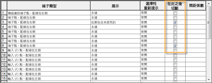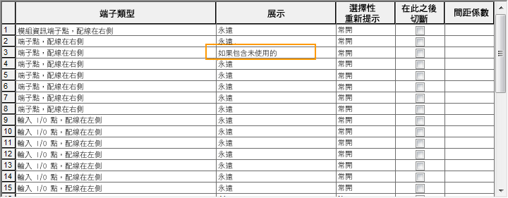 - 包含在 PLC 模組的 PLC 資料庫定義中定義為 「如果包含未使用的」的端子。