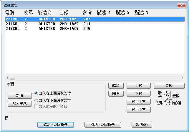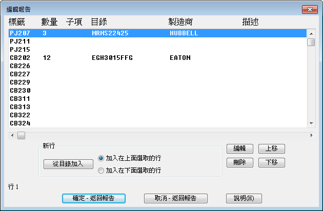 修改報告,然後再將其插入到您的圖面或儲存至檔案中。可以在報告中上移或下移資料,在目錄中加入行以及刪除行。