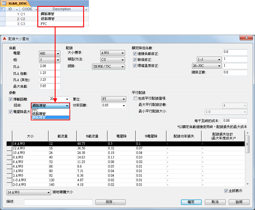 描述表格 XL&R_DESC 包含在「配線大小查找」對話方塊中用於導管或線槽類型選取清單的標示。還將標示對映到資料表格中的欄。
