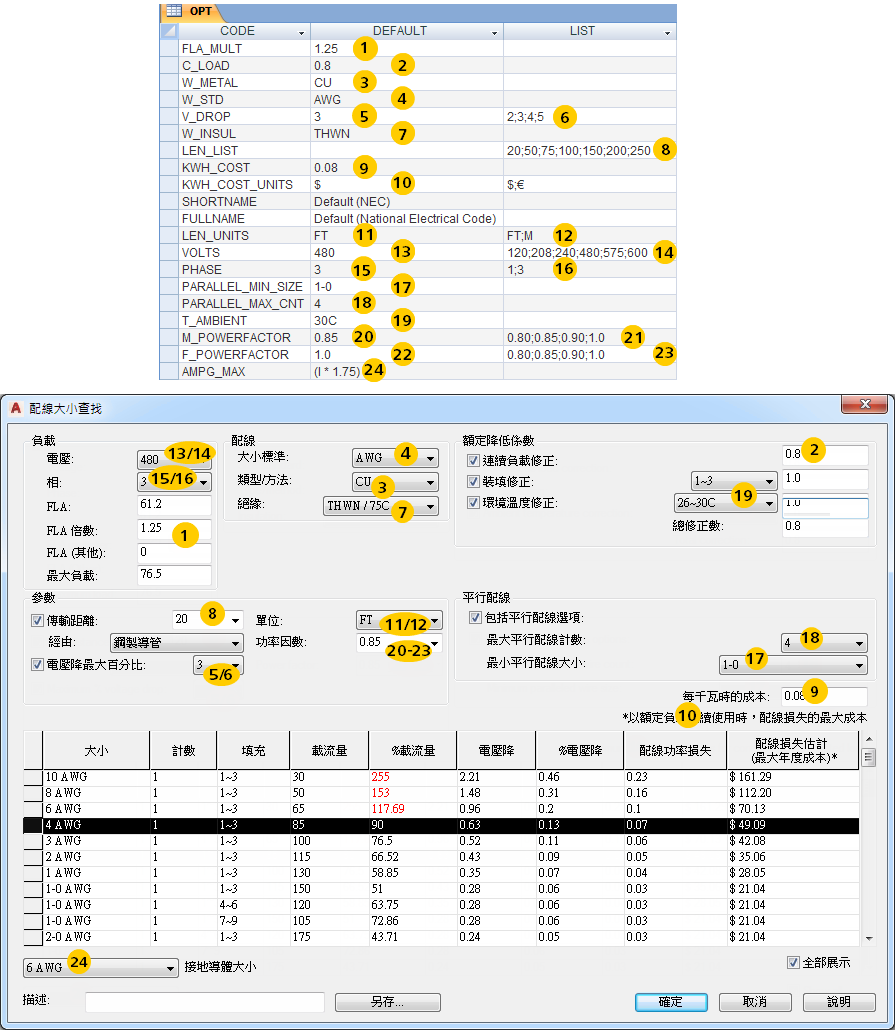 選項表格包含用於定義預設值的值,以及專用於 Electrical 標準的選項清單。例如,預設為銅製佈線、AWG 大小標準,以及用於導體長度單位的英呎。