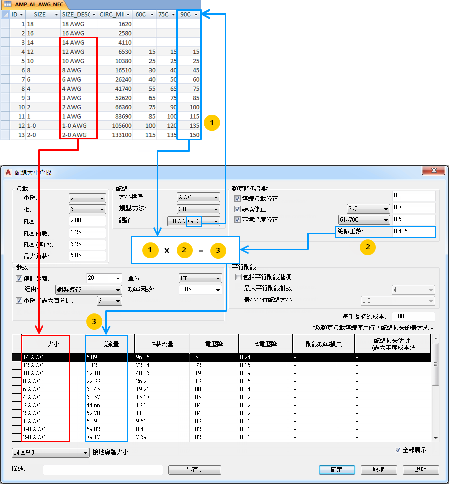 例如,名為 AMP_CU_AWG_NEC 的表格包含關於銅製、AWG 大小的配線載流量資訊,並符合「國家電工法規」。