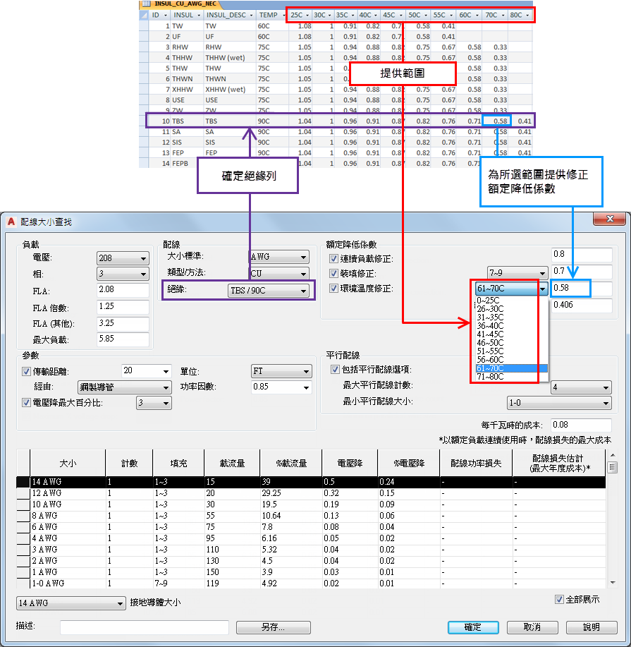 配線絕緣表格可提供用於根據預期最大環境溫度額定降低導體載流量的選項。