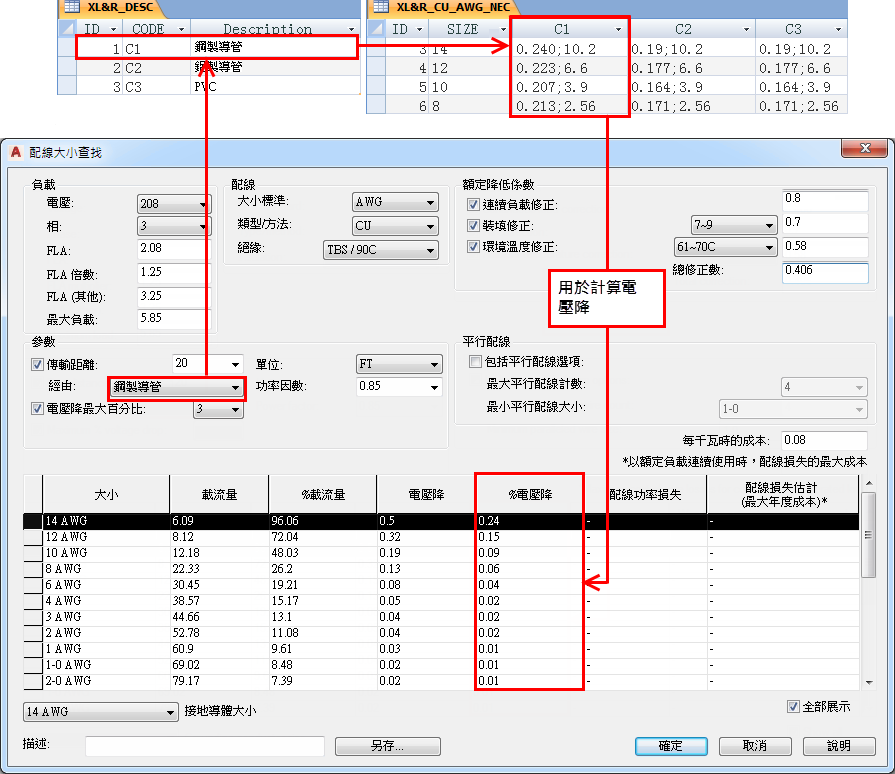 可選的導體電抗/交流電阻表格可根據導管類型提供配線大小的電抗和電阻。提供傳輸距離後,這些值可用於計算電源佈線中的電壓降百分比。