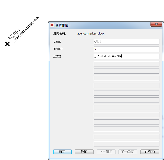 註: 在標識圖塊上定義的屬性值將取代所有定義在工作表中的值。