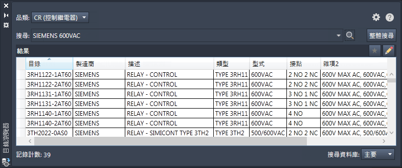 例如,當您對沒有目錄值的繼電器線圈按一下「查找」,您希望「目錄瀏覽器」搜尋「600VAC」繼電器的 Siemens 零件號碼。編輯目錄資料庫檔案,然後選取 _LISTBOX_DEF 表格。插入包含以下欄位值的記錄: