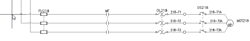 放置馬達電路,使插入點位於線參考 204 處的左側垂直母線上,然後按一下左鍵以插入電路。