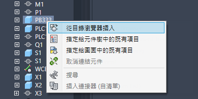 將元件樹中未連結的 Inventor 零件與 AutoCAD Electrical toolset 元件連結 (從圖面中的目錄瀏覽器插入)。