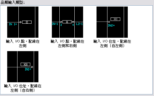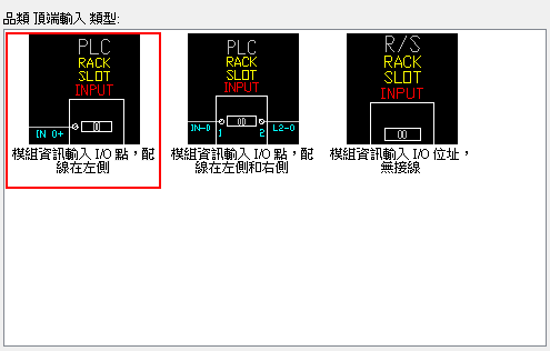 將顯示「選取端子資訊」對話方塊。頂端符號包括三種品類:頂端輸入、頂端輸出和頂端端子。「頂端輸入」和「頂端輸出」是可定址端子,而「頂端端子」品類則由不可定址端子組成。