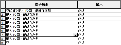將選取的端子指定給「PLC 資料庫檔案編輯器」對話方塊中的「端子類型」。AutoCAD Electrical toolset 將會檢查圖塊,以查看插入圖塊時所加入的屬性。某些加入的屬性具有可被覆蓋的預先定義的值。您會在端子類型清單下方的格線中看到這些預先定義的值。