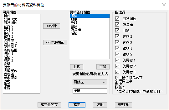 開啟一個對話方塊,您可以在其中指定要在報告中包括的欄位、欄位順序、欄位標示和文字對正方式。