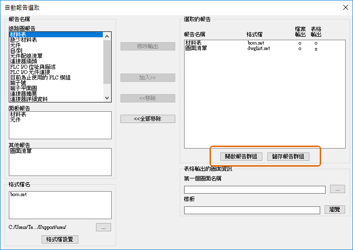 如果經常執行同一報告群組,則可以將該群組儲存為一個報告群組。若要設置報告群組,請加入所有格式檔案 (如同要執行報告一樣),然後儲存報告群組。有關格式檔案的資訊儲存在報告群組檔案中,其副檔名為 .rgf。下次要執行該組報告時,可開啟先前儲存的 .rgf 檔案。
