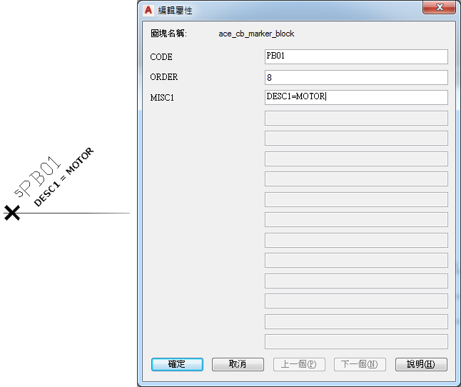 - 使用格式「{屬性名稱}={屬性值}」編輯其雜項 1 屬性值,例如,「DESC1=MOTOR」。