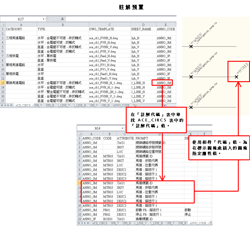 註: 註解預置值可取代標識圖塊上定義的屬性值。在標識圖塊上定義的屬性值將取代所有定義在工作表中的值。