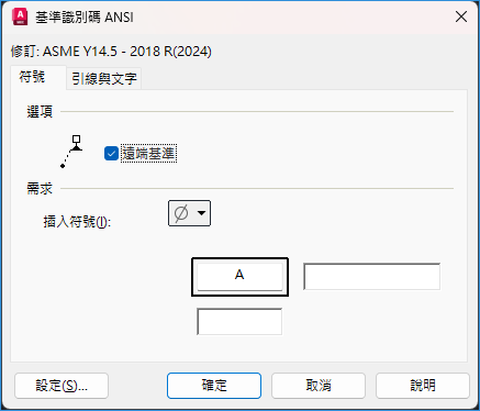 「基準識別碼 ANSI」對話方塊包括最新的標準修訂 ASME Y14.5 – 2018 R(2024)。該對話方塊現在提供在遠端插入符號的選項。在「需求」下,提供「基準註記」和「螺紋註記」欄位,以及「插入符號」選項。