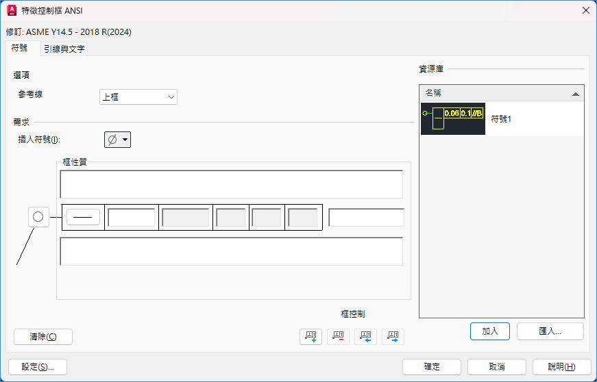 「特徵控制框 ANSI」對話方塊包括最新的標準修訂 ASME Y14.5 – 2018 R(2024),提供最新的註解和需求。該對話方塊支援多框功能,允許視需要增加更多框,以及用於內嵌註記的欄位。插入符號資源庫在「其他符號」品類下有新符號。