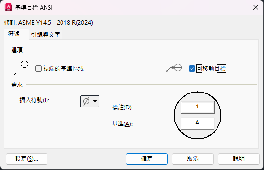 「基準目標 ANSI」對話方塊包括最新的標準修訂 ASME Y14.5 – 2018 R(2024)。該對話方塊現在支援插入可動目標符號的新選項。