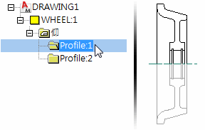 在此範例中,資料夾 Profile:1 包含上輪的輪廓。Profile:2 為此資料夾的另一例證,它是透過鏡射 Profile:1 建立的。變更一個輪廓會自動更新其他輪廓。