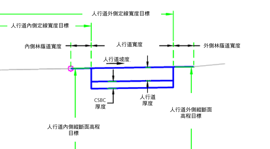 可以選擇性地透過貼附到偏移定線取得多個元素寬度。另外,可以透過連接到偏移縱斷面得出人行道橫向坡度。