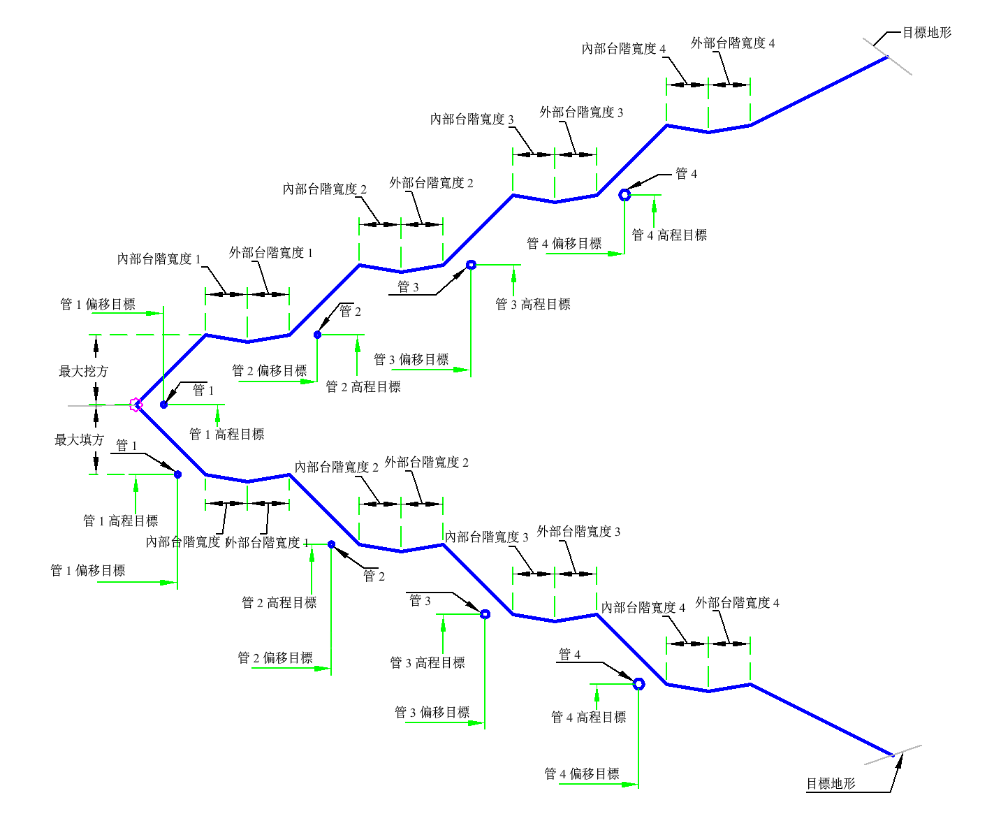 您可以在台階定義窪地寬度。會在每個台階加入管。最後一個邊坡坡度至目標地形可能不同於台階坡度。