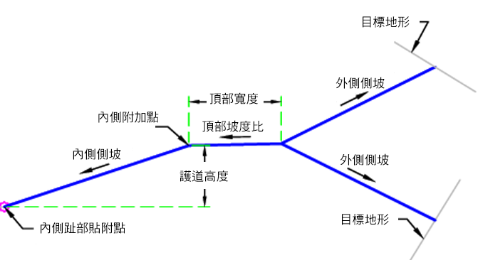 | 貼附點 | 建置護道的起始貼附點。 | 坡腳內側/頂部內側 | 坡腳內側 |