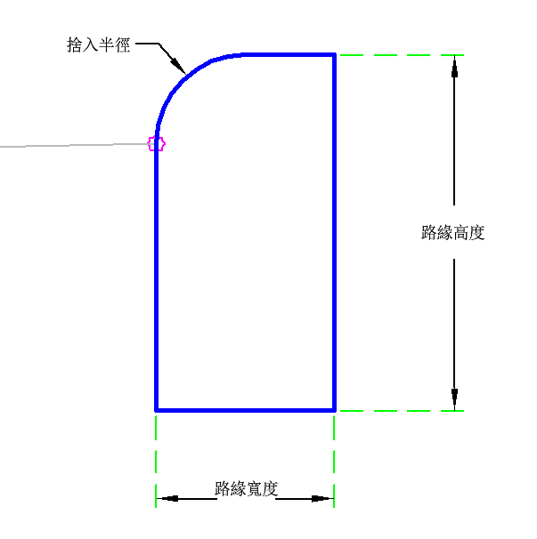 路緣連接是根據輸入參數標註插入。所有標註都必須為非零的正值,以取得最佳結果。會檢查參數以確保輸入半徑產生有效結果。