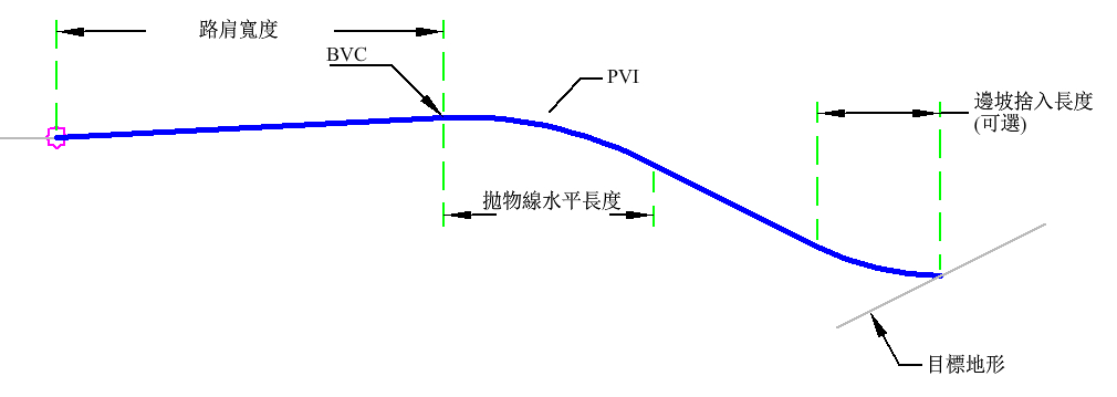 此外,您也可以選擇定義從原點到 PVI 或從原點向 BVC (垂直曲率的起點) 的路肩寬度標註。