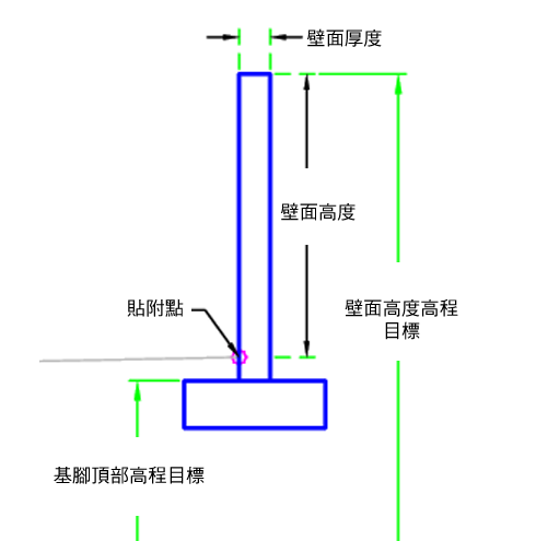 | 壁面高度 | 可以用於取代壁面高度,並將牆頂部高程連接至縱斷面高程。以下物件類型可以用作指定高程的目標:縱斷面、3D 聚合線、地勢線或測量圖形。 | 可選 |