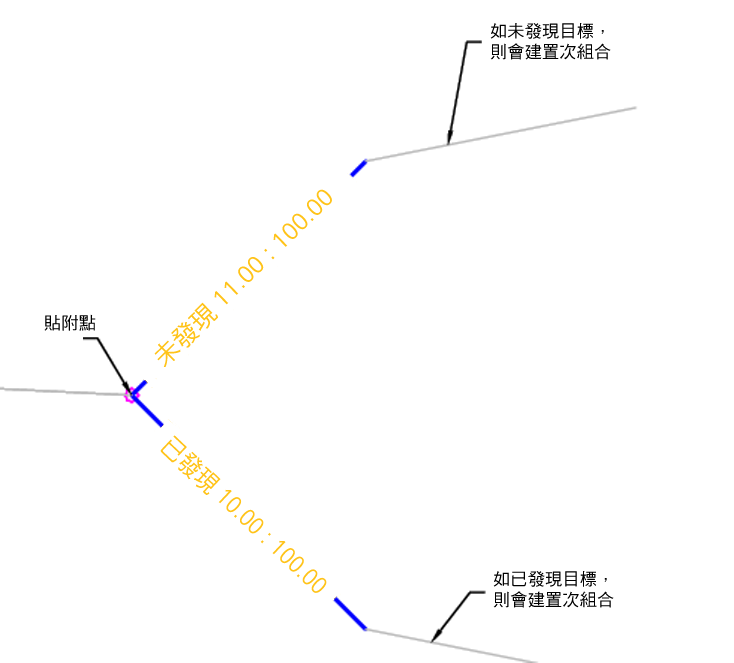 | 情況 | 指定可用於此次組合的情況。如果在最大距離之內找到偏移目標,則處理「找到」情況。如果未設定偏移目標或在最大距離內的樁號處找不到偏移目標,則處理「找不到」情況。 | 找到/找不到 | 找到 |