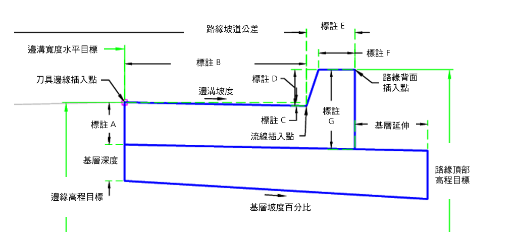 | 標註 C | 從凸緣點到邊溝流線的深度 | 正數,非零 |