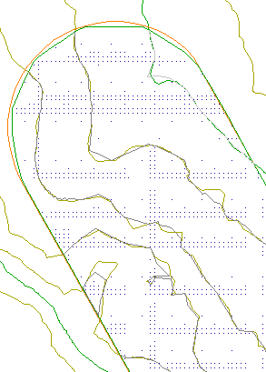 請注意,這些點的密度沒有本練習開始時的密度大,並且新的灰色地形等高線與原始等高線非常相似。「簡化地形」指令減少了地形使用的資料數量,而地形準確度並未降低太多。