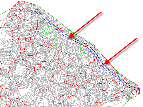 特徵線可用來定義地形圖徵,並強制沿著特徵線三角化。地形不會沿著特徵線三角化,以建立更為精準的不規則三角網地形模型。