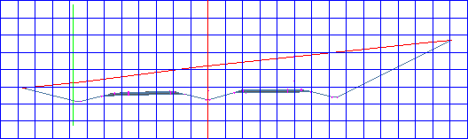 請注意此樁號處的超高變化。對凹陷中央次組合使用「中心線軸」選項將使車道和路肩在中心線溝渠上方某點附近超高。靠車道地形放置的直線邊緣將經過縱坡點。