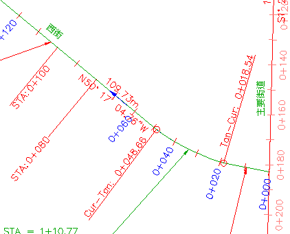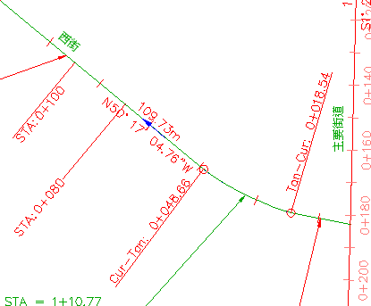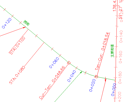 請注意,您在〈練習 2:使用子標示型式〉中變更的 STA:0+ 080 和 STA:0+100 標示也仍然可見。這是因為其餘的主要樁號標示使用的是參考圖層 0 的「與記號互垂」型式。標示 STA=0+060 和 STA=0+080 使用的是參考 C-ROAD-LABL 圖層的「互垂於直線」和樁號突出型式。
