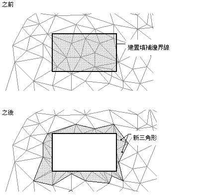 有時可能需要刪除不規則三角網線,例如,當地形的週界上具有狹長的不規則三角網三角形時。在這種情況下,對於該地形來說這些三角形可能不夠精確,應該將其刪除。