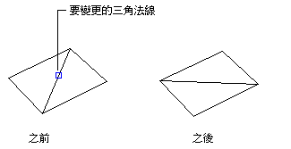 邊緣交換用於在地形中變更兩個三角形面的方向,從而建立更精確的地形模型。例如,可以交換三角形邊緣以使其與山脊或窪地相符。