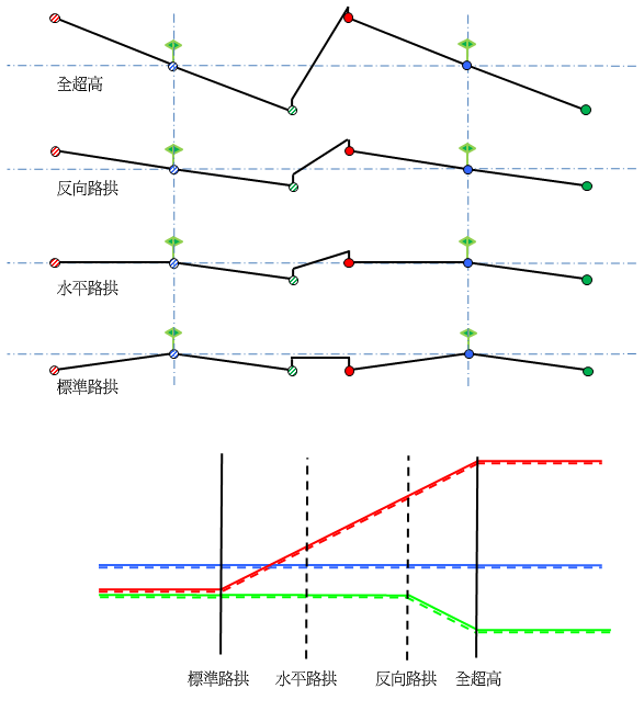 位於中心的樞軸 (分割的拱形道路上的超高)