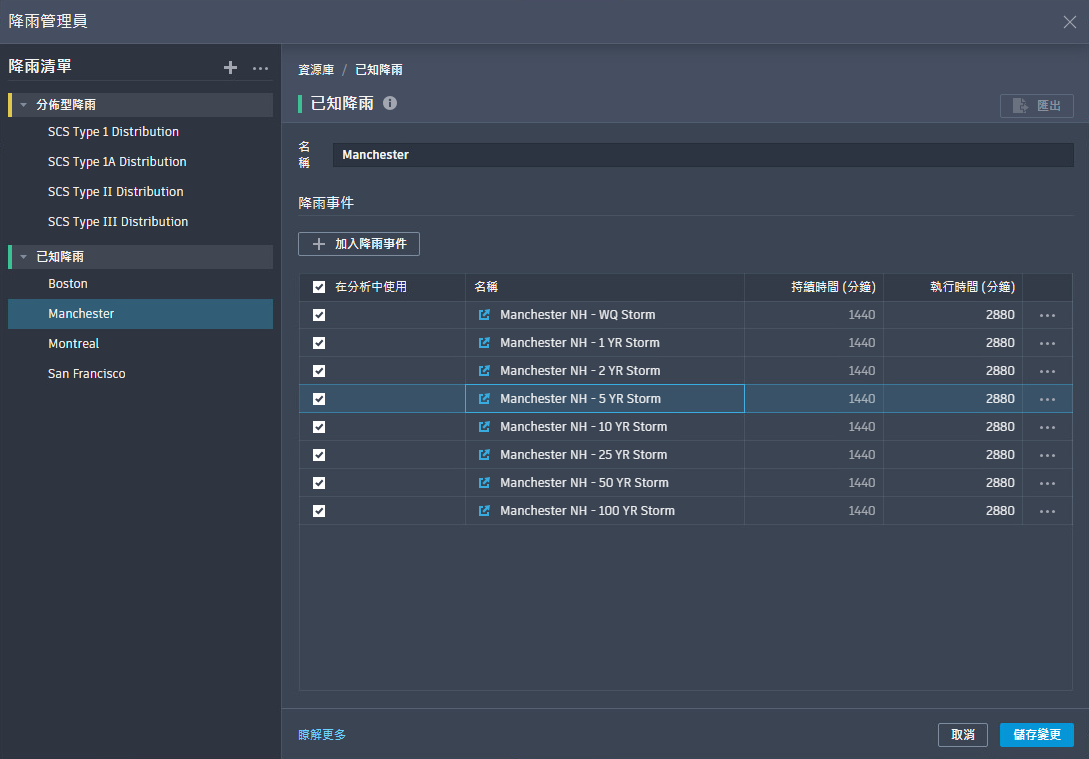 「降雨管理員」提供了一個集中位置,用於建立、編輯和管理軟體中使用的所有降雨資料。這些資料包括預先定義的降雨模式和使用者建立的自訂事件。「降雨管理員」能將降雨資料整合為常用資料集,確保不同分析間能快速存取並保持資料一致性。