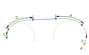 直線長度是自動計算的。如果編輯任一貼附曲線 (1、2),則螺旋線長度 (3、4) 均不會發生變更。