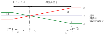 平面配合法需要兩個公式:一個用於與標準橫向坡度方向相反的曲線,一個用於在標準橫向坡度方向上延續的曲線。下圖展示了標準化的坡度超高,其中未設置超高的道路從左至右向下傾斜。因此,至左側的曲線需要的變化長度比至右側的曲線長。