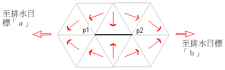 此種類型的集水區稱為多重排水口,因為流入此口的水來自於 p1 和 p2,並且可以排向排水目標「a」或「b」,如下圖所示: