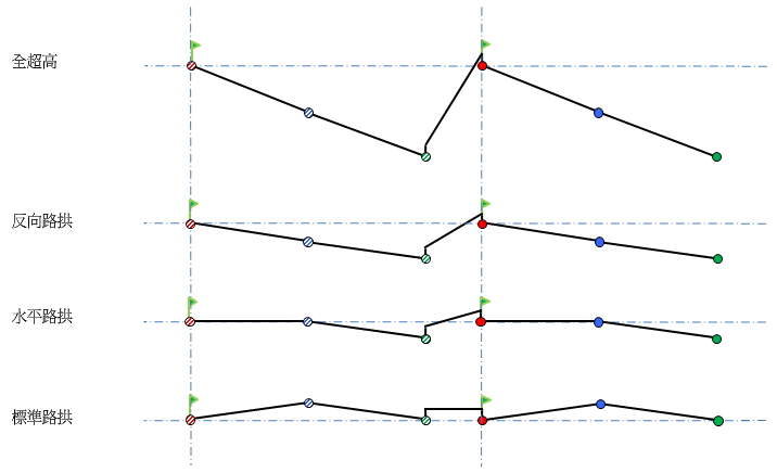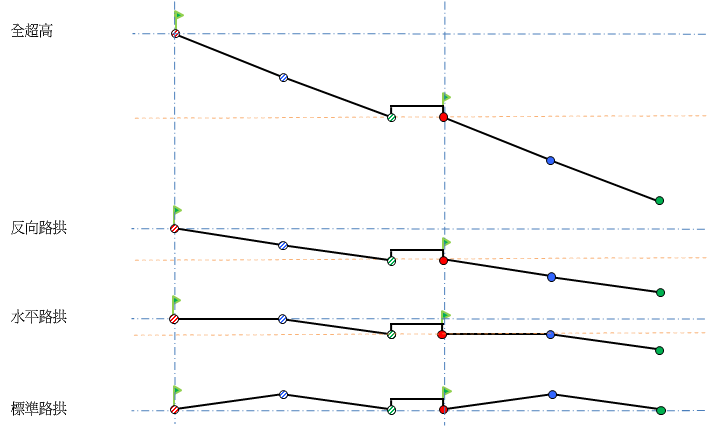 本小節介紹了分割的道路的情況,並說明了對於每種情況將如何套用超高。