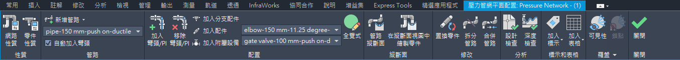 若要存取「壓力管網平面配置」功能區,請執行以下其中一個作業: