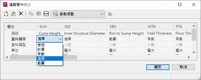 - 若要為零件加入可用大小的清單,請將大小參數的資料儲存類型變更為「清單」。