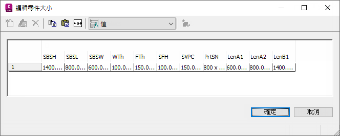 - 若要加入零件的新大小,請按一下參數值,然後按一下工具列上的「編輯」。