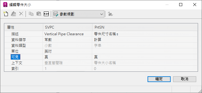 將顯示「編輯零件大小」對話方塊,展示選取零件的所有目前可用的大小參數。對於簡單圓柱結構零件範例,某些預設大小參數為「零件大小名稱」(PrtSN) 和「結構垂直管間隙」(SVPC)。