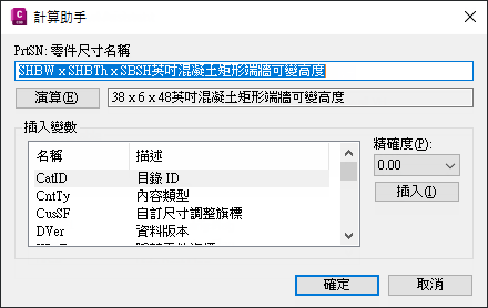 將顯示與參數值關聯的計算字串。例如,結構的「零件大小名稱」(PrtSN) 的計算公式可能為「SHBW x SHBTh x SBSH 英吋混凝土矩形端牆」。而對於管,公式可能為 FormatNumber($PID,0) +「英吋混凝土管」。