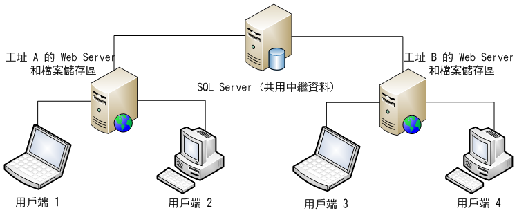 Vault 的可選多重站台功能設計用於支援地理位置分散的工作群組共用 Vault。下圖為遠端 SQL 管理多個伺服器的單一例證,每個伺服器位於不同的辦公室站台,並配備了其獨自的檔案儲存區。如果其權限層級足夠高,則所有使用者均可以在所有站台上查看所有檔案,就像該系統為一個單一的資料庫。