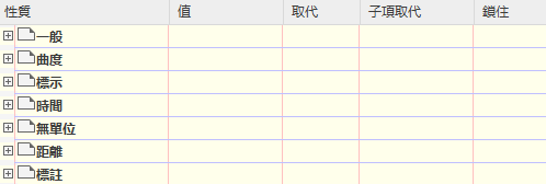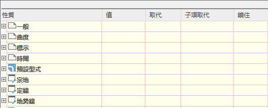「編輯圖徵設定 - 宗地」對話方塊 (下方對話方塊) 的「取代」欄中的勾選標記表示,此對話方塊中設定的值取代了較高層級的設定。
