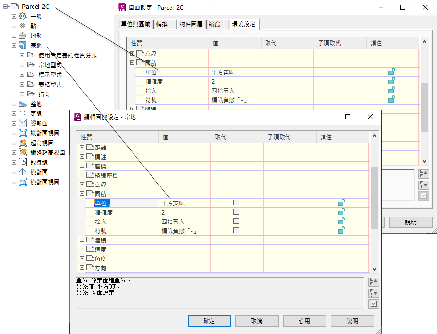 設定架構中每個較低層級的物件均可繼承或取代高於該層級的層級中的設定。下圖展示了在「宗地」圖徵層級的面積單位的取代集。