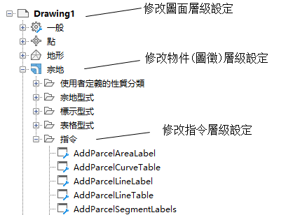 使用「設定」樹狀目錄中的「指令」集合層級可以逐條指令地取代物件層級設定和圖面環境設定。還可以指定特定用於指令的設定。